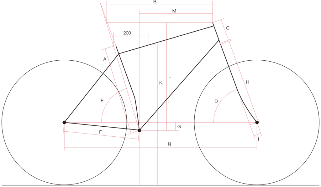 | フレームサイズ | トップチューブ長(水平換算) | ヘッドチューブ長 | ヘッドアングル | シートアングル | リアセンター | ハンガー下がり | フォーク首下長 | オフセット | スタンドオーバーハイト | スタック | リーチ | ホイールベース |